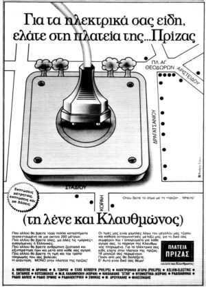 «Για τα ηλεκτρικά σας είδη, ελάτε στη πλατεία της… Πρίζας (τη λένε και Κλαυθμώνος).»